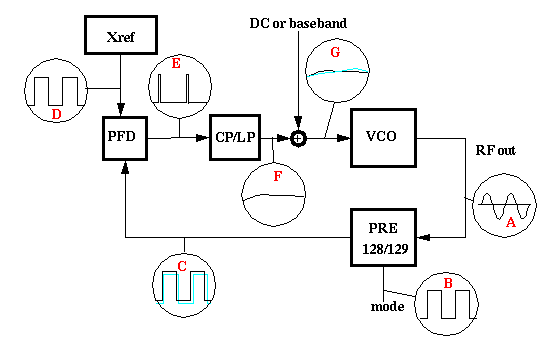 Am Punkt A ist das Ausgangssignal eines RF VCO als typisches Sinussignal dargestellt. Die Frequenz liegt im Bereich von 1,6 GHz bis 2 GHz. Das entspricht dem Durchstimmbereich des VCO05. Der Prescaler PRE erhaelt dieses RF Sinussignal als Eingangsfrequenz, die je nach momentanwert des anliegendem Modesignales B in ein niederfrequentes Digitalsignal C umgesetzt wird. Der Phase-Frequency-Detektor PFD vergleicht die Phasenlage des Signales C mit der Phasenlage eines Referenzsignales D. Dabei wird das Referenzsignal D extern bereitgestellt. Der PFD generiert die up und down Steuersignale E fuer die Ladungspumpe. Mittels der Ladungspumpe und dem Tiefpassfilter CP/LP wird ein analoges Steuersignal F gebildet. Fuer Modulationszwecke kann das analoge Steuersignal F mit einem weiteren Analogsignal G veraendert werden. In der aktuellen Schaltungsimplementation ist diese Signaladdition nicht enthalten, so dass das Steuersignal F direkt auf den Steuereingang des VCO geschaltet ist. Damit bestimmt der Momentanwert des Steuersignales F die aktuelle Schwingfrequenz des VCO.