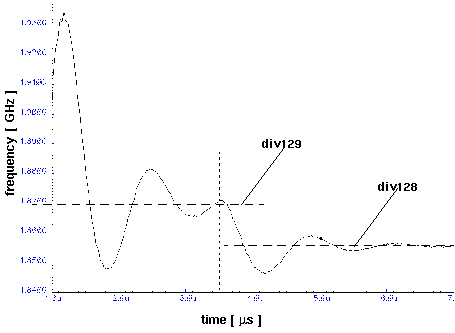 Hier ist ein typischer Verlauf der Frequenz am Punkt A, also direkt nach dem VCO ueber der Zeit dargestellt. Mann erkennt das typische Einschwingverhalten und die Schleifendaempfung des Regelkreises. Am Anfang der Simulation ist die Schwingfrequenz sehr weit vom Sollwert entfernt und die Regelung setzt mit einer sehr grossen Amplitude ein, die jedoch schnell abklingt. Nach ca. 3,5 microsec. ist die Freqenz von ca. 1.87 GHz erreicht und der Modeeingang wird umgeschaltet. Da die Frequenzaenderung nur ca. 14 MHz betraegt ist auch die daraus resultierende Systemantwort der Regelung nicht so gross wie nach dem Einschalten. Nach ca. 7 microsec. ist die neue Freqenz entsprechend dem kleineren Teilerfaktor eingestellt worden.