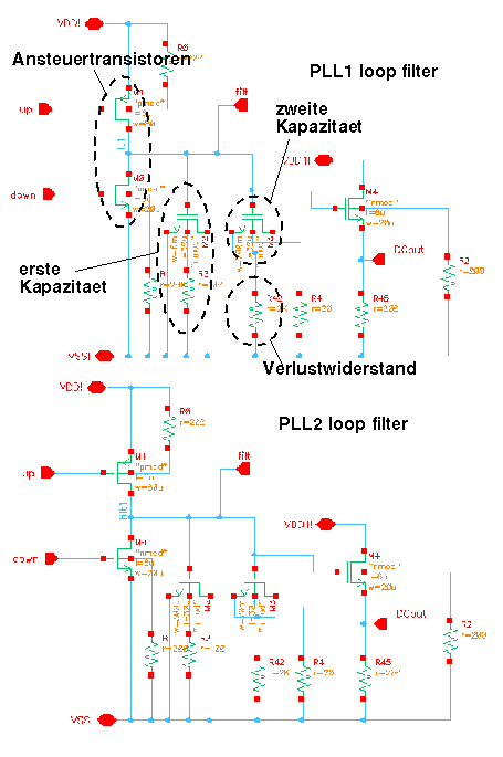 Die Ladungspumpe ist bei allen Filtervarianten gleich und besteht jeweils aus zwei einfachen Schalttransistoren. Die erste und zweite Filterkapazitaet wird auf Grund der erforderlichen grossen Werte mittels MOS Kapazitaeten gebildet. Die Gate-Drain Kapazitaet wird auf Grund der sehr genauen Gateoxiddickensteuerung sehr praezise eingehalten. Durch die geringe Gateoxiddicke werden verhaeltnismaessig grosse Kapazitaeten bei kleiner Strukturgrundflaeche erreicht, wodurch Substratstoerungen geringere Auswirkungen erreichen. Eine PLL Schaltung ist an dem Knoten, an dem die Filterspannung gebildet wird anfaellig gegen Stoereinkoppelungen, da im eingeschwungenen Zustand der Regelschleife hier fuer laengere Zeit das Signal hochohmig gehalten werden muss.