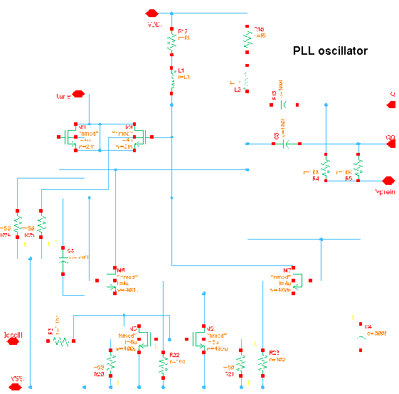 Die hier vorgestellten PLL Schaltungen dienen dem Test der RF Schaltungen VCO und Prescaler in einer typischen Phasenregelschleife fuer Frequenzsynthesizer. Dabei wird kein vollstaendiger Frequenzsynthesizer fuer die Erzeugung von einzelnen Empfangs- oder Sendekanaelen integriert, sondern ausschliesslich eine geschlossene Regelschleife nachgebildet. Durch die Modeumschaltung kann aber auch ein Frequenzsprung simuliert werden und das entsprechende Einschwingverhalten mit Schleifenverzoegerung und Schleifenregeldaempfung gemessen werden.