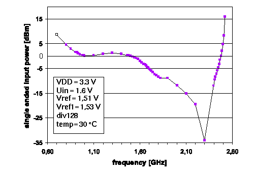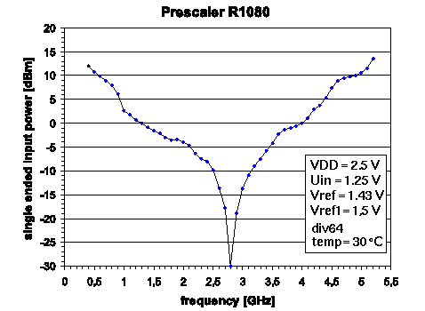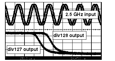 There exist timing problems in the actual circuit implementation. Therefore the division ratio of 128/129 is reduced to 127/128. Measurements with cooled chips deliver a normal circuit operation. These problems have been verified in simulation and fixed in a first redesign in June 1999.