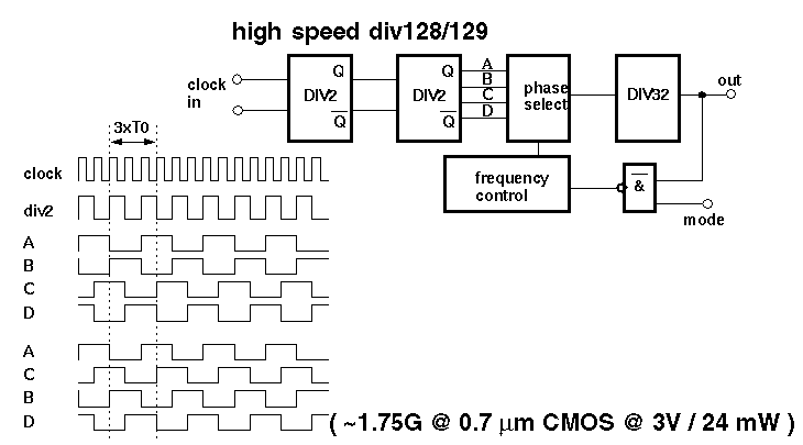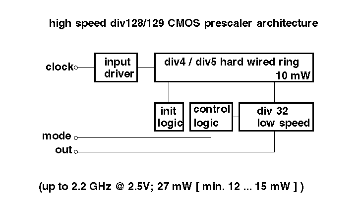 | CMOS 0.25 m m | 7.5 G | 18 mW@2.5V | div128/129 standard, power down |
