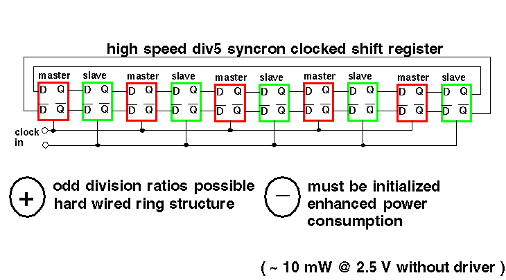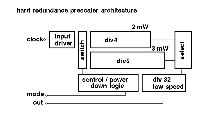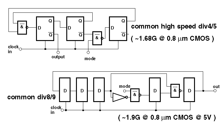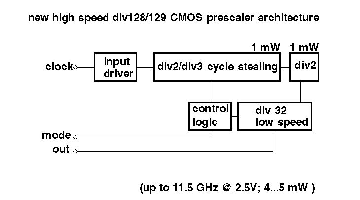 | CMOS 0.25 m m | 9.5 G | 8 mW@2.5V | div128/129 cycle stealing method, power down |